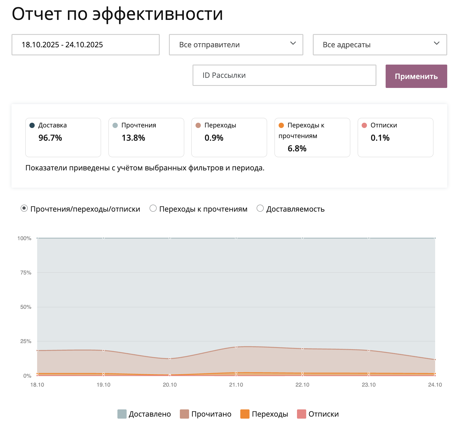 Показан процент уникальных прочитанных писем, писем хотя бы с одним переходом и отписок — по отношению к общему количеству доставленных писем.Все события привязываются к дате отправки, а не к моменту прочтения или перехода.